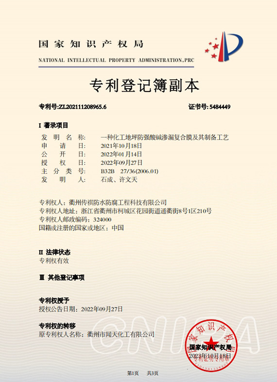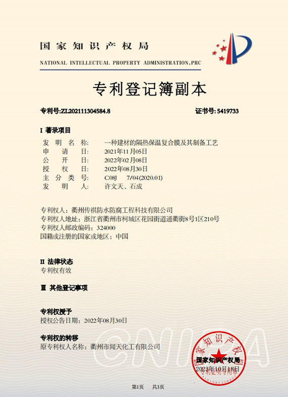 衢州傳祺新材料科技有限公司是衢州市聞天化工有限公司的下屬企業(yè);衢州市聞天化工有限公司成立于2003年,是國(guó)內(nèi)最早研發(fā)、生產(chǎn)氟碳涂料的企業(yè)之一。衢州傳祺新材料科技有限公司成立于2017年,公司專(zhuān)注于高分子氟材料的開(kāi)發(fā)和含氟材料在防腐、防水領(lǐng)域的應(yīng)用。經(jīng)過(guò)6年的不懈努力,已獲得了化工和建筑領(lǐng)域六項(xiàng)國(guó)家發(fā)明專(zhuān)利授權(quán)和兩項(xiàng)新產(chǎn)品科技成果獎(jiǎng),參與了中國(guó)建筑材料流通協(xié)會(huì)《房屋修繕?lè)浪こ桃?guī)范》標(biāo)準(zhǔn)的編制工作,中建協(xié)涂裝委員會(huì)浙西工作站設(shè)立在我公司。